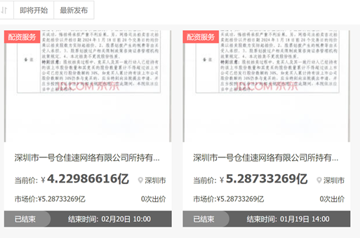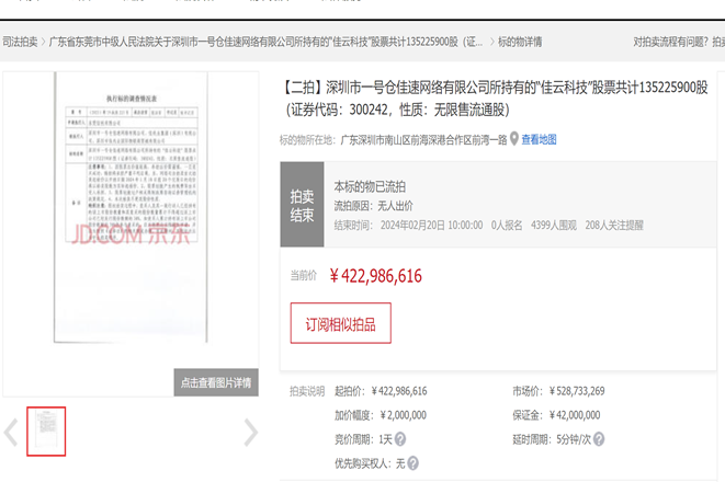记者查询京东网络司法拍卖平台了解到,佳速网络持有的1.35亿股“佳云科技”股票第二次拍卖的起拍价是4.23亿元,市场价约为5.29亿元。平台显示,该股票标的的二拍起拍价相对一拍已经下调,二次拍卖流拍原因为无人出价,与第一次拍卖流拍原因相同。