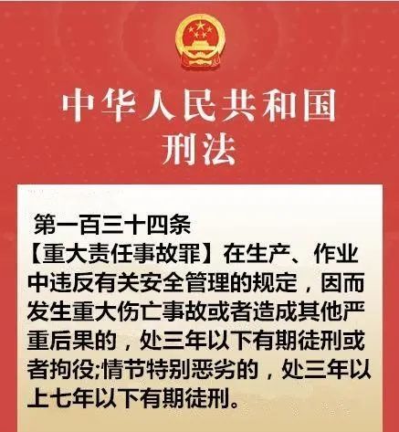 第一百三十四条 在生产、作业中违反有关安全管理的规定,因而发生重大伤亡事故或者造成其他严重后果的,处三年以下有期徒刑或者拘役;情节特别恶劣的,处三年以上七年以下有期徒刑。