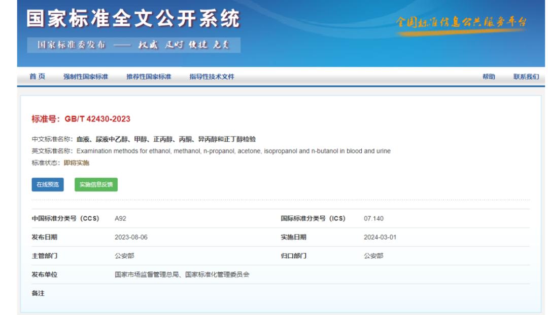 国家标准《血液、尿液中乙醇、甲醇、正丙醇、丙酮、异丙醇和正丁醇检验》(GB/T 42430-2023),于2024年3月1日起实施。