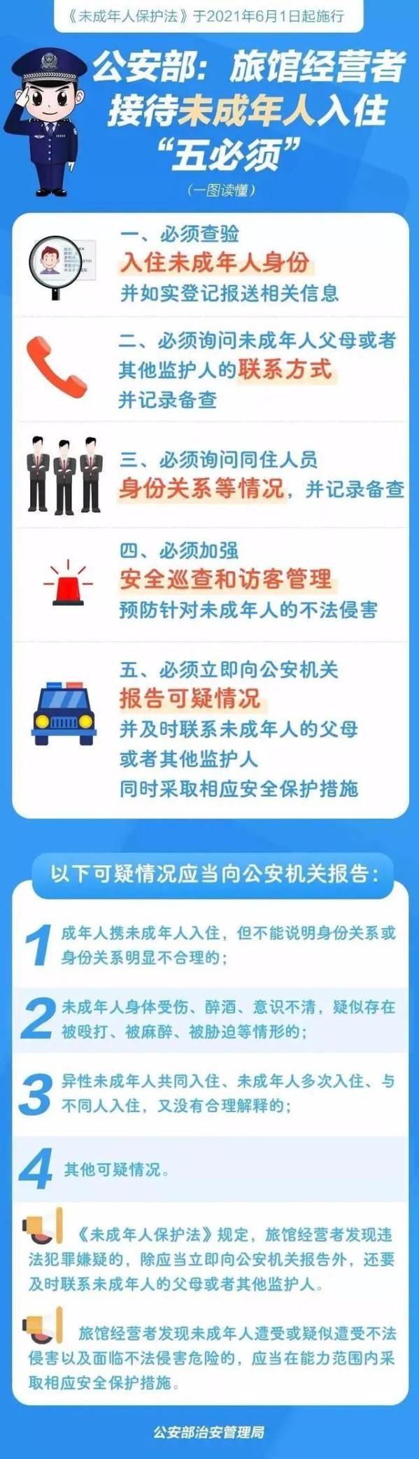 原标题:《公安部:旅馆经营者接待未成年人入住,应落实“五个必须”要求》