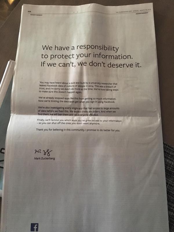 当地时间3月25日,美国社交媒体脸书公司创始人、首席执行官马克·扎克伯格在在6份英国报纸和3份美国报纸上,采用道歉信形式为5000万Facebook用户信息被英国数据公司剑桥分析泄露和利用一事道歉。