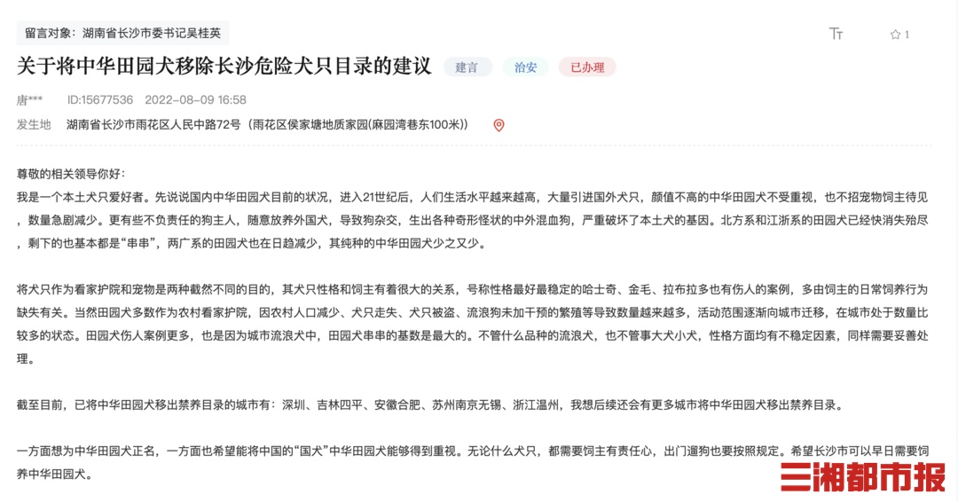 8月9日,有长沙网友在人民网“领导留言板”留言,建议将中华田园犬移除长沙危险犬只目录。