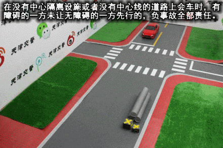 《实施条例》第四十八条第(二)项“在没有中心隔离设施或者没有中心线的道路上,机动车遇相对方向来车时应当遵守下列规定:(二)在有障碍的路段,无障碍的一方先行;但有障碍的一方已驶入障碍路段而无障碍的一方未驶入时,有障碍的一方先行”之规定。