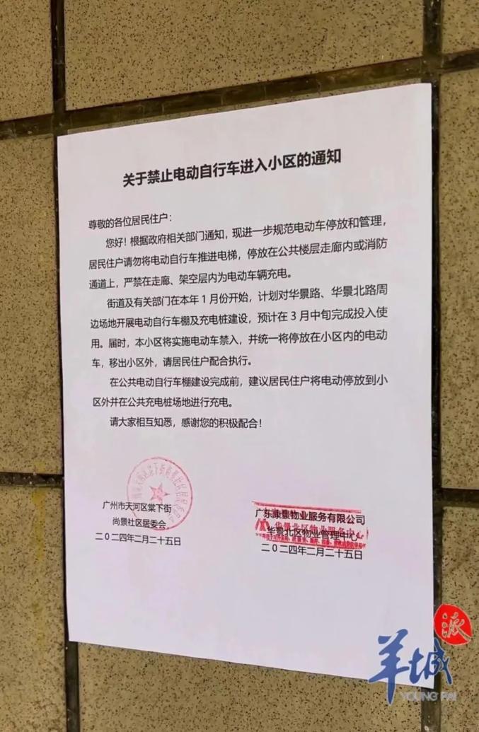 仅过了1天,位于珠江俊园小区西北面,同属天河区棠下街道管辖的华景新城陶然庭苑小区,当地尚景社区居委会和小区物管联合发布《关于禁止电动自行车进入小区的通知》。