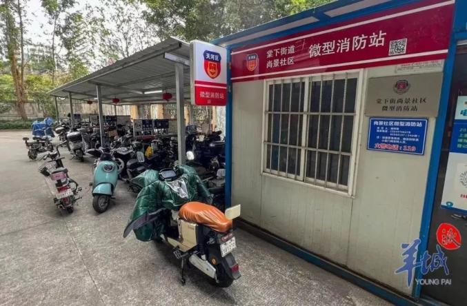 广州华景新城陶然庭苑小区,微型消防站设在户外“电鸡”充电处旁