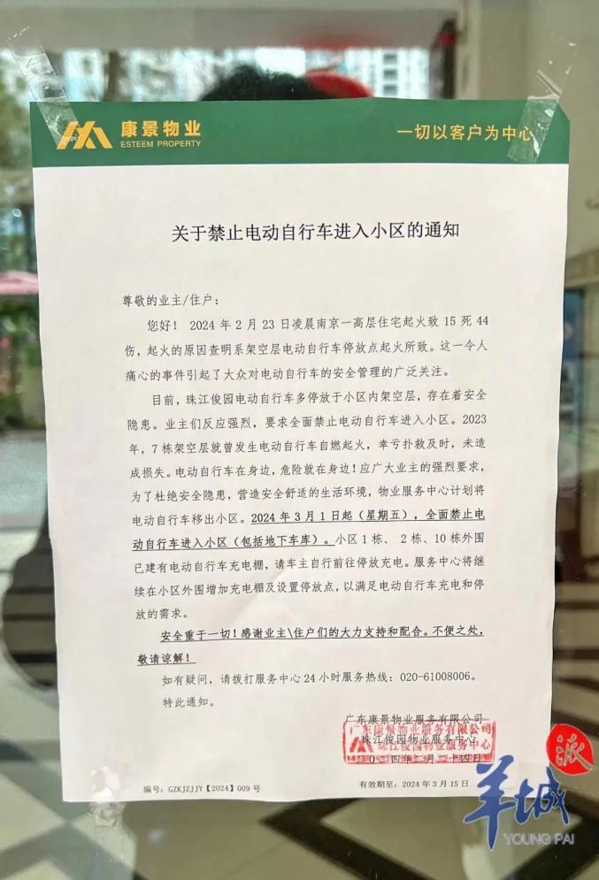 根据通知内容,该小区将自3月1日起全面禁止电动自行车进入小区及地下车库范围,并建议车主将电动自行车停在小区外围的停放点、在小区外围的充电点充电。