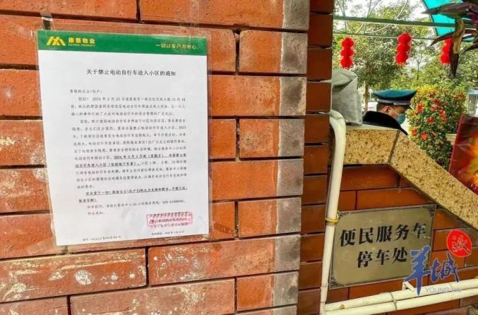 2月24日,广州市天河区棠下街道珠江俊园小区居民,议论着物管新贴出的《关于禁止电动自行车进入小区的通知》。