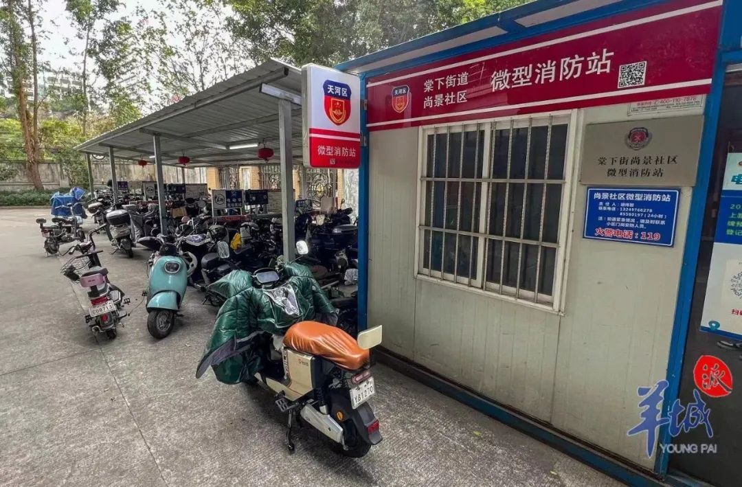 该小区在户外公共空间设置了“电鸡”停放和充电点,并将一个微型消防站设在“电鸡”停放及充电点旁以防不测。