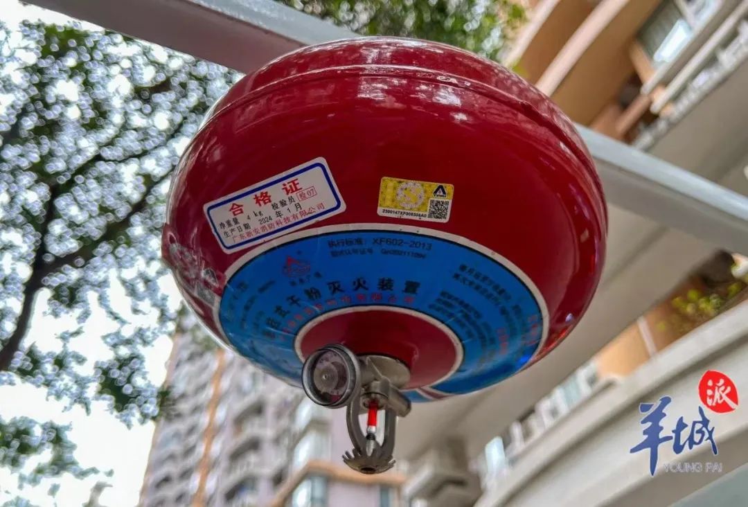 这些停放点和充电点大多设有雨棚,在电动自行车停放处的上方还设有圆鼓状的悬挂式干粉灭火装置。
