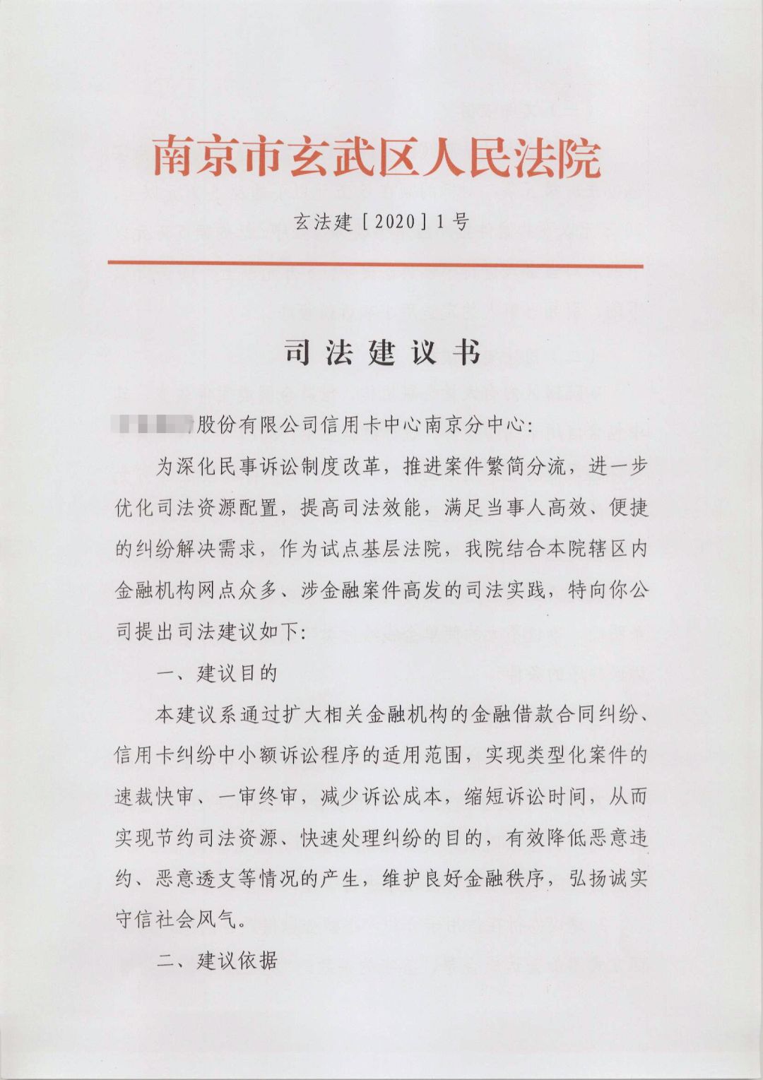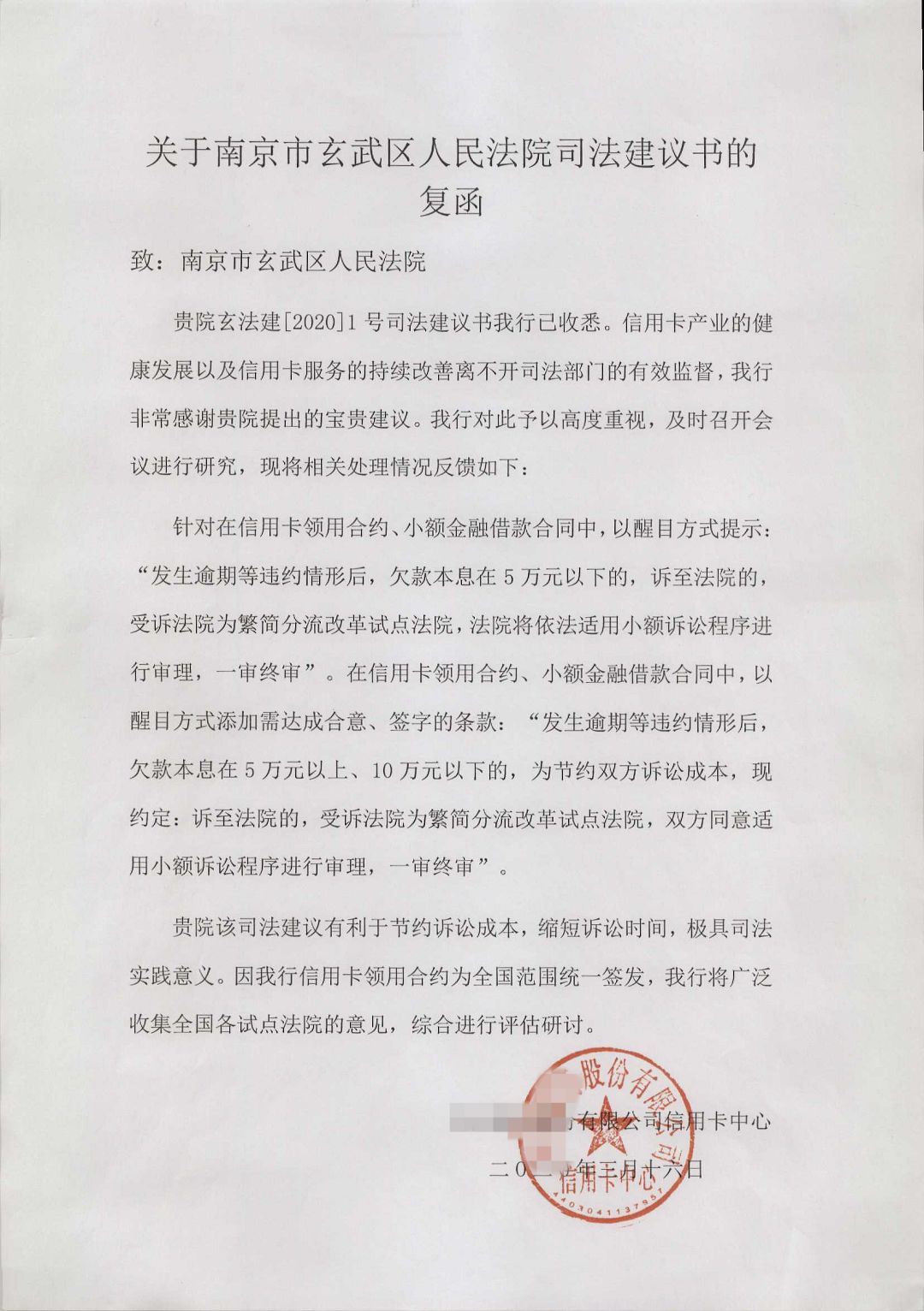 同年3月20日,玄武法院收到某银行信用卡中心对司法建议书的复函,函中对司法建议书作出了“有利于节约诉讼成本,缩短诉讼时间,极具司法实践意义”的高度评价,并表示作为全国统一签发的信用卡合约,将广泛收集全国各试点法院意见,综合进行评估研讨。