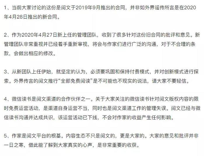 面对大众的层层炮轰,阅文集团也于今日做出了官方回应,不仅强调“绝不会全部实行免费阅读”,也提出将于5月6日组织作者恳谈会进行进一步协商: