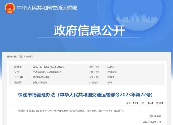 新修订的《快递市场管理办法》(以下简称《办法》)将于2024年3月1日起施行。其中,未经用户同意不得擅自使用智能快件箱、快递服务站等方式投递快件等规定尤为引人关注。