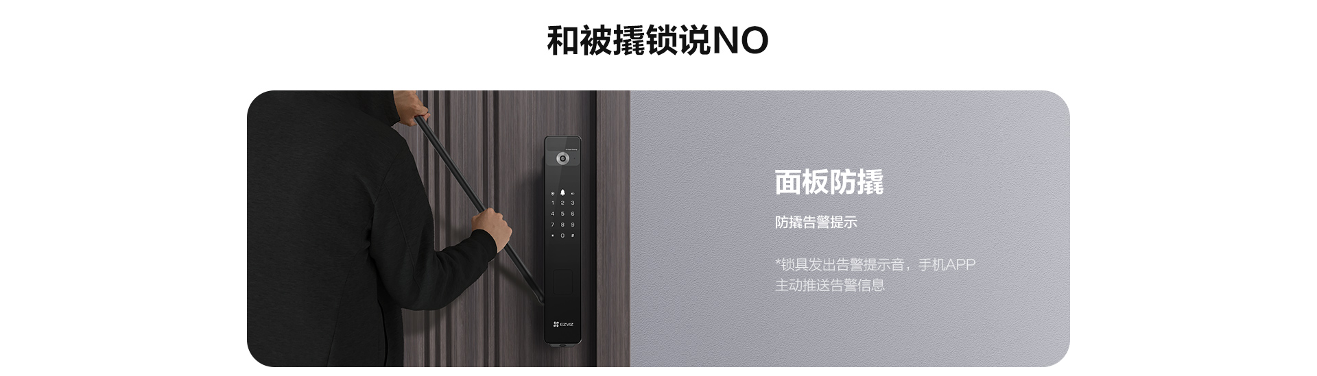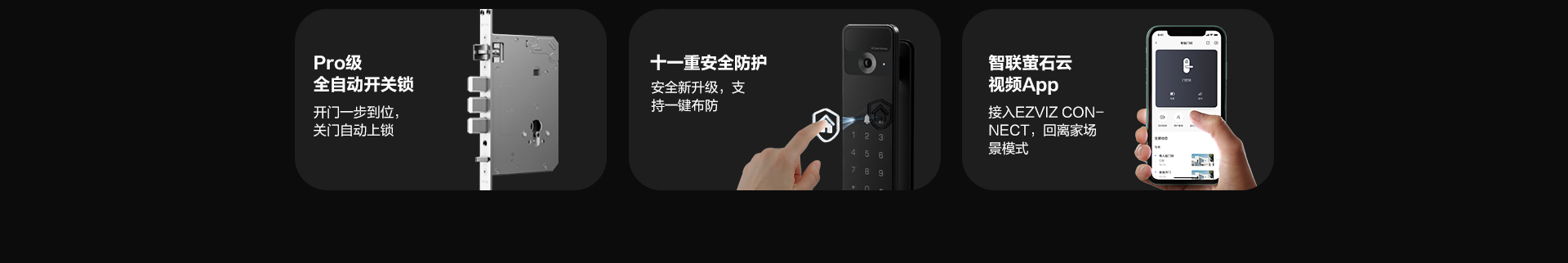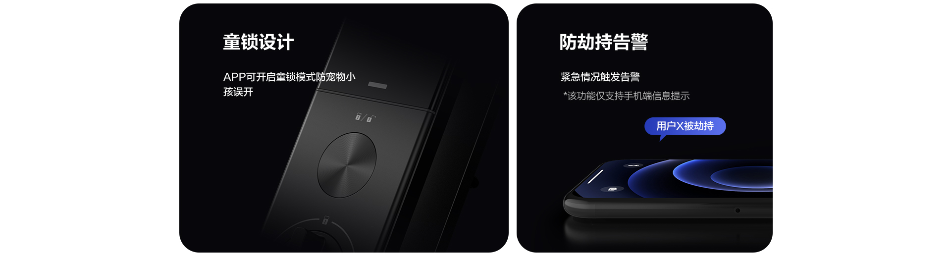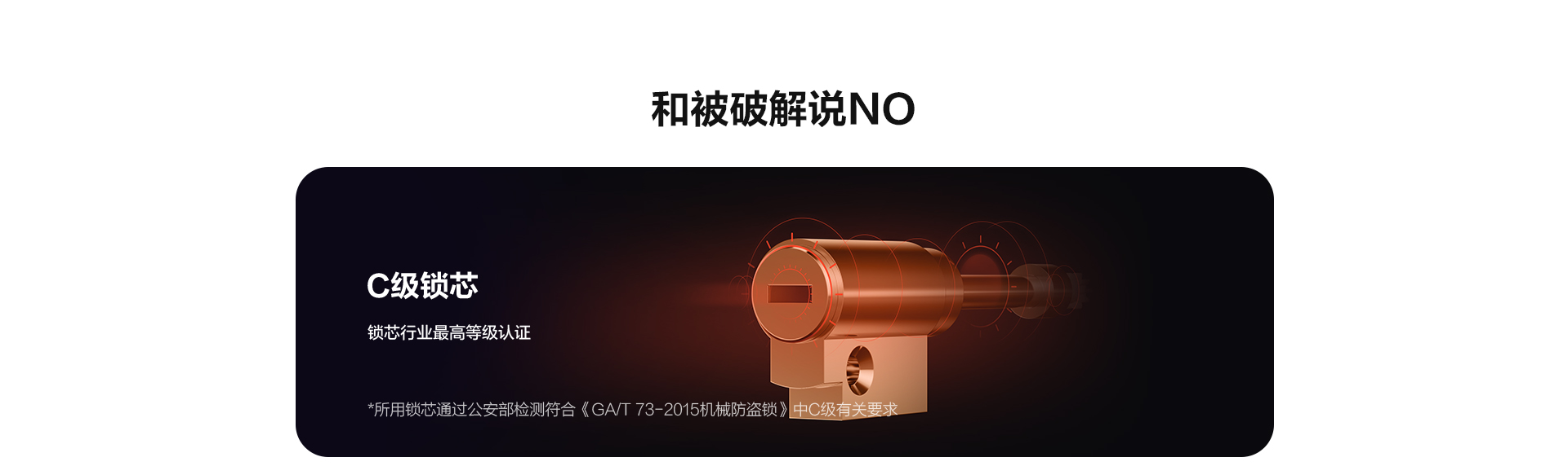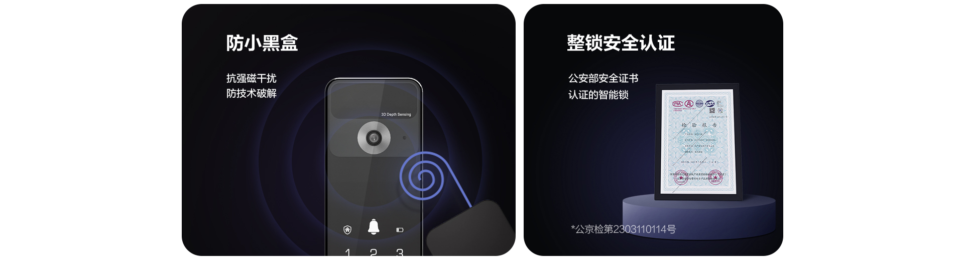 锁具安全防护   离家一键布防,锁体状态全检测,直插式C级锁芯,应急机械开锁,童锁防护,双重验证解锁,虚位密码设计,防小黑盒设计,试错锁定报警,布防模式室内开门报警,门锁被撬报警