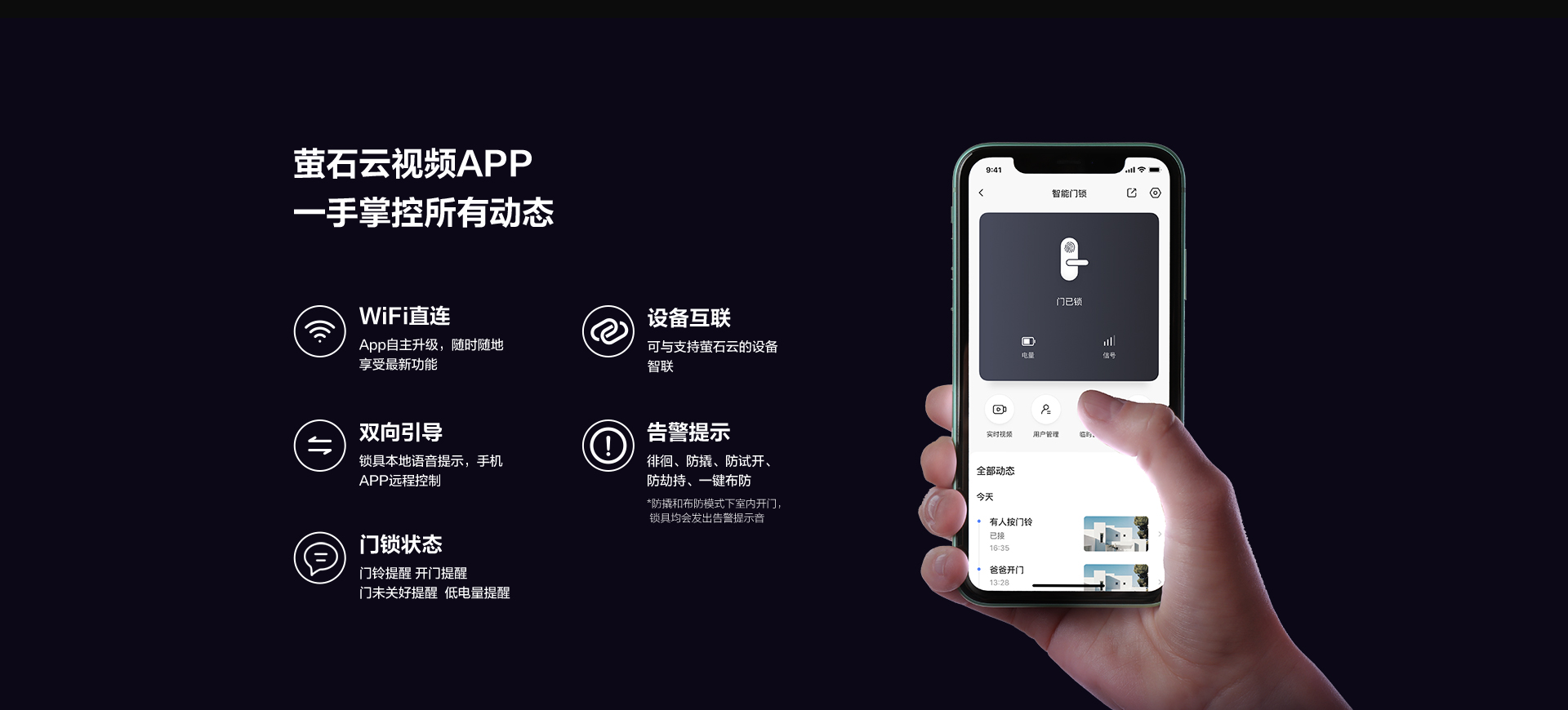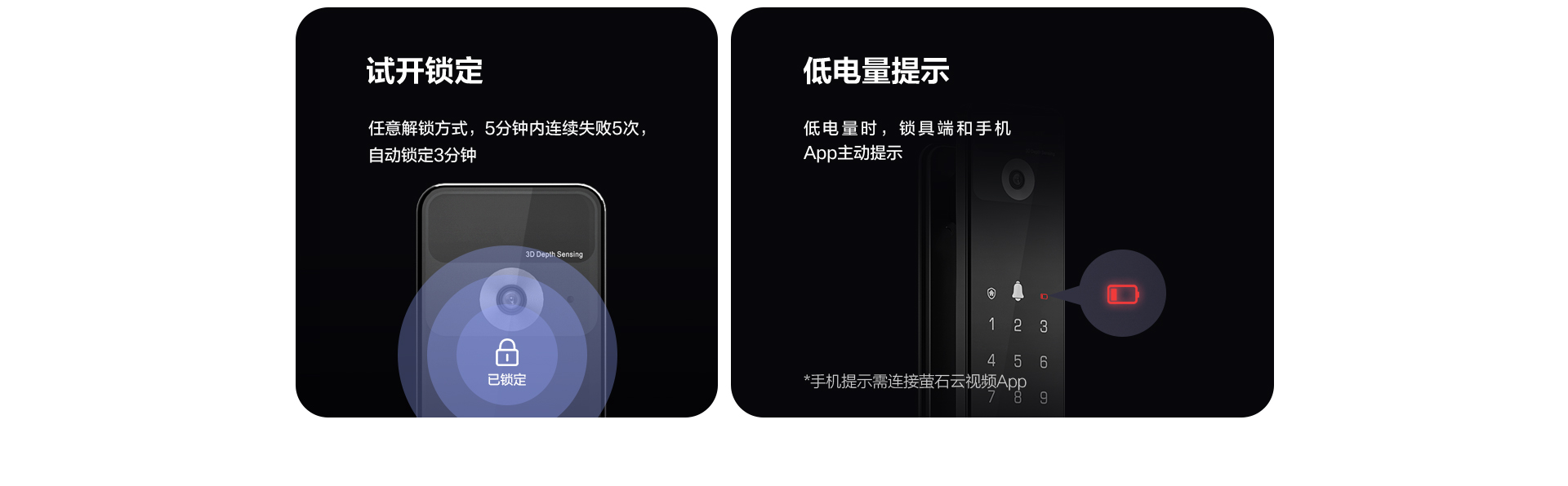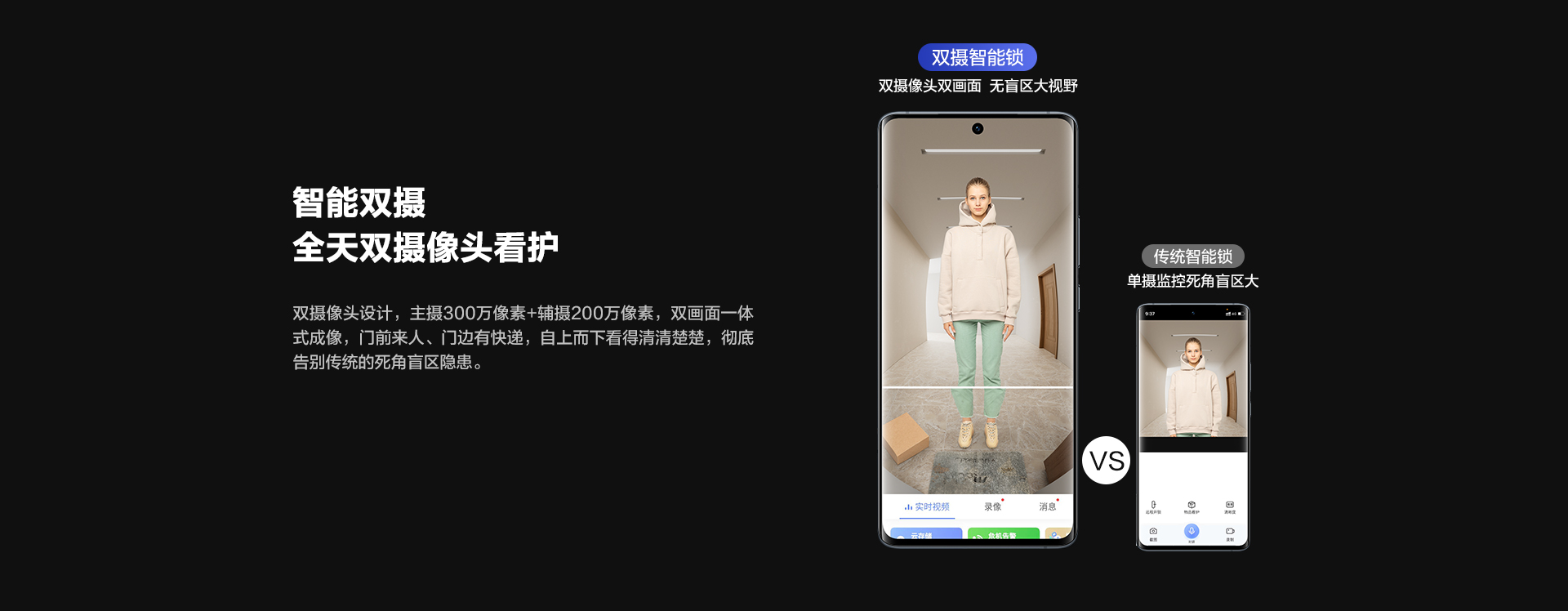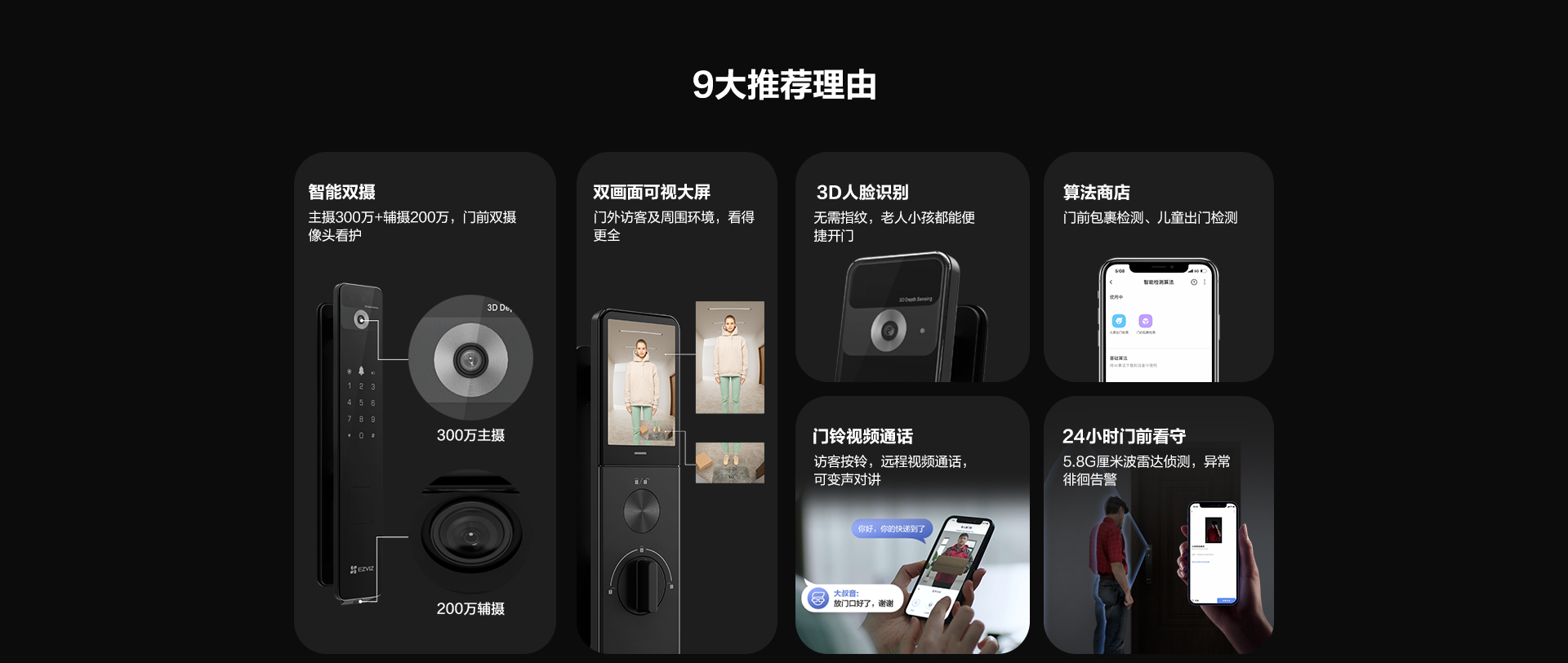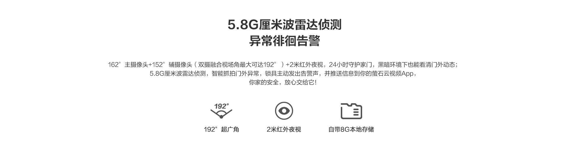 锁具安全防护   离家一键布防,锁体状态全检测,直插式C级锁芯,应急机械开锁,童锁防护,双重验证解锁,虚位密码设计,防小黑盒设计,试错锁定报警,布防模式室内开门报警,门锁被撬报警