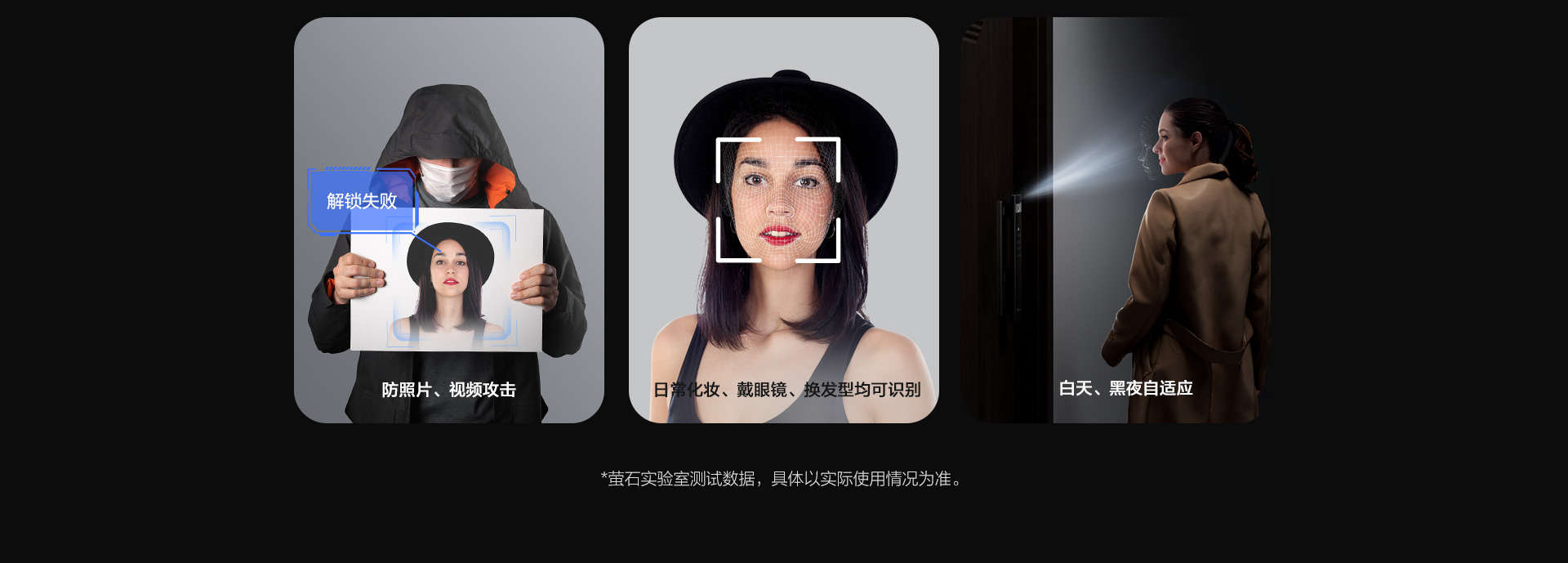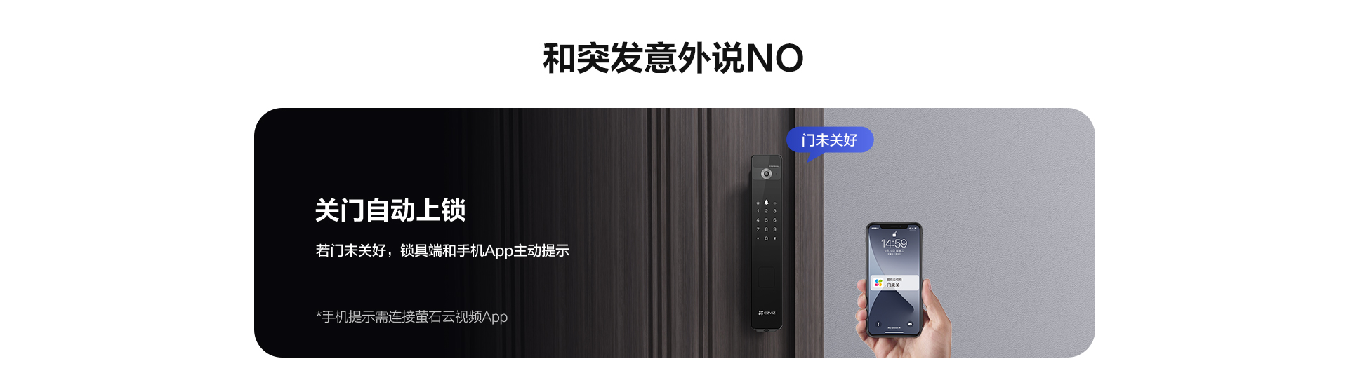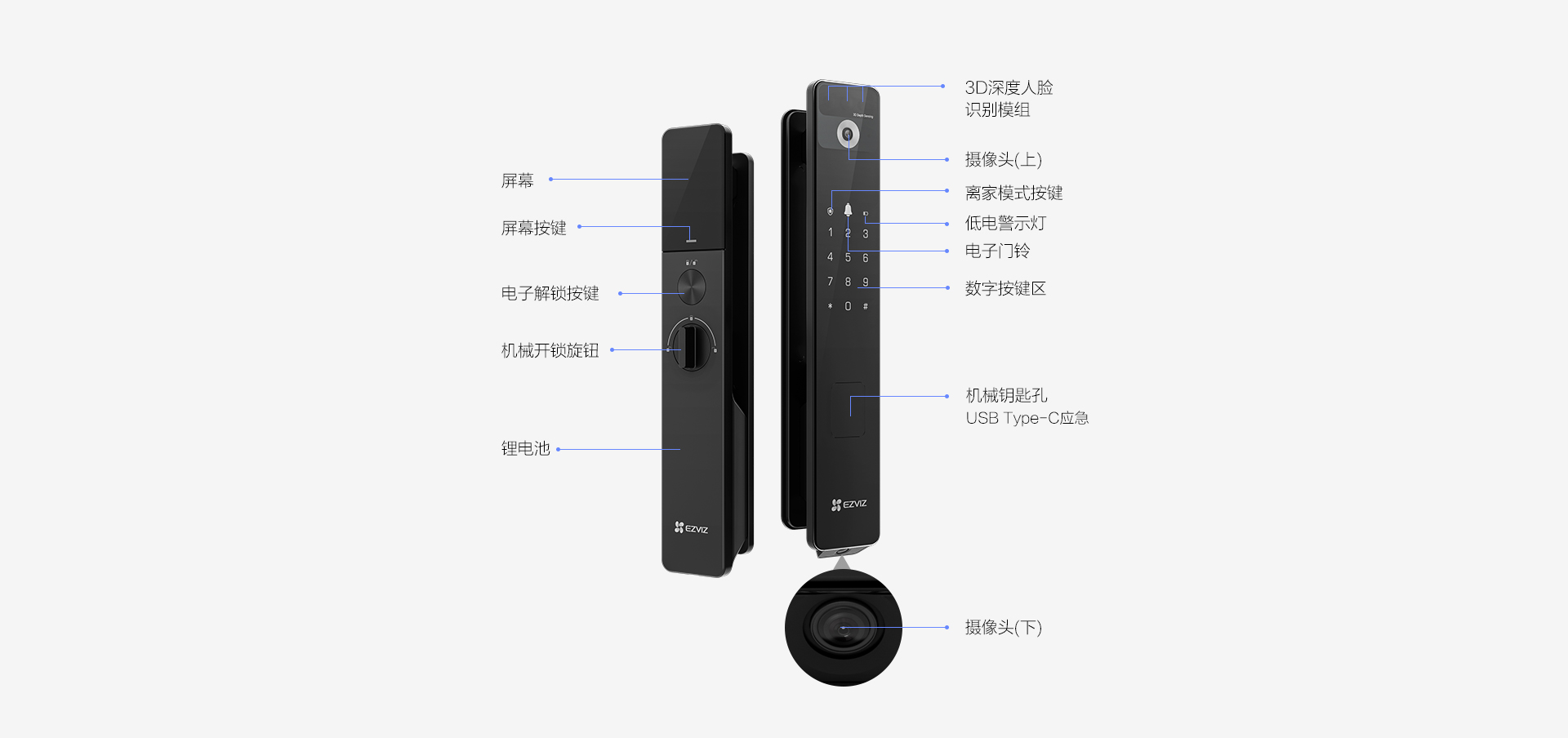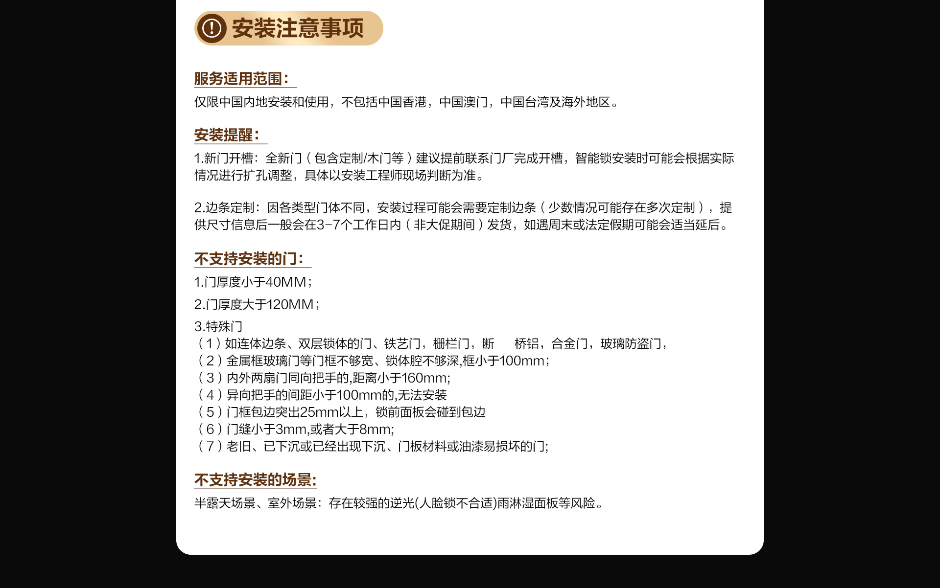 锁具安全防护   离家一键布防,锁体状态全检测,直插式C级锁芯,应急机械开锁,童锁防护,双重验证解锁,虚位密码设计,防小黑盒设计,试错锁定报警,布防模式室内开门报警,门锁被撬报警