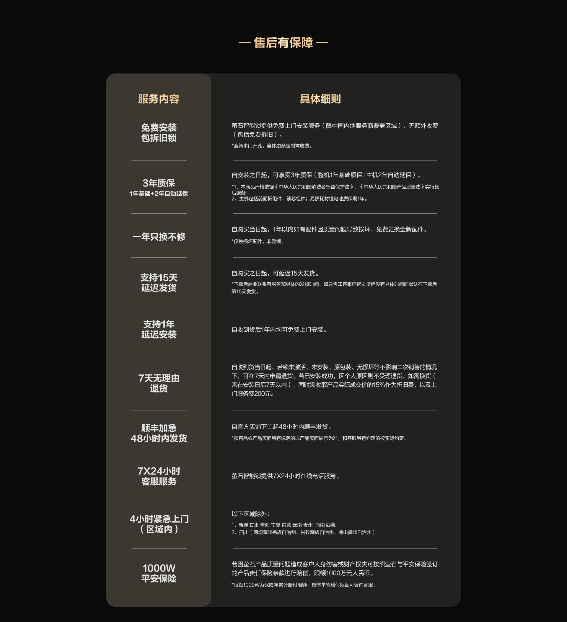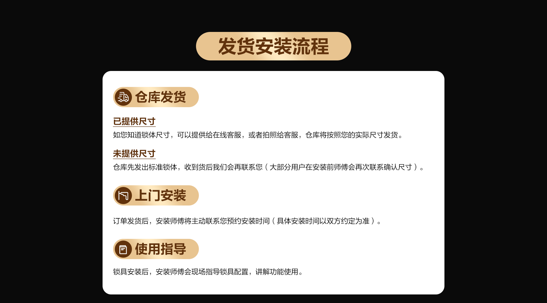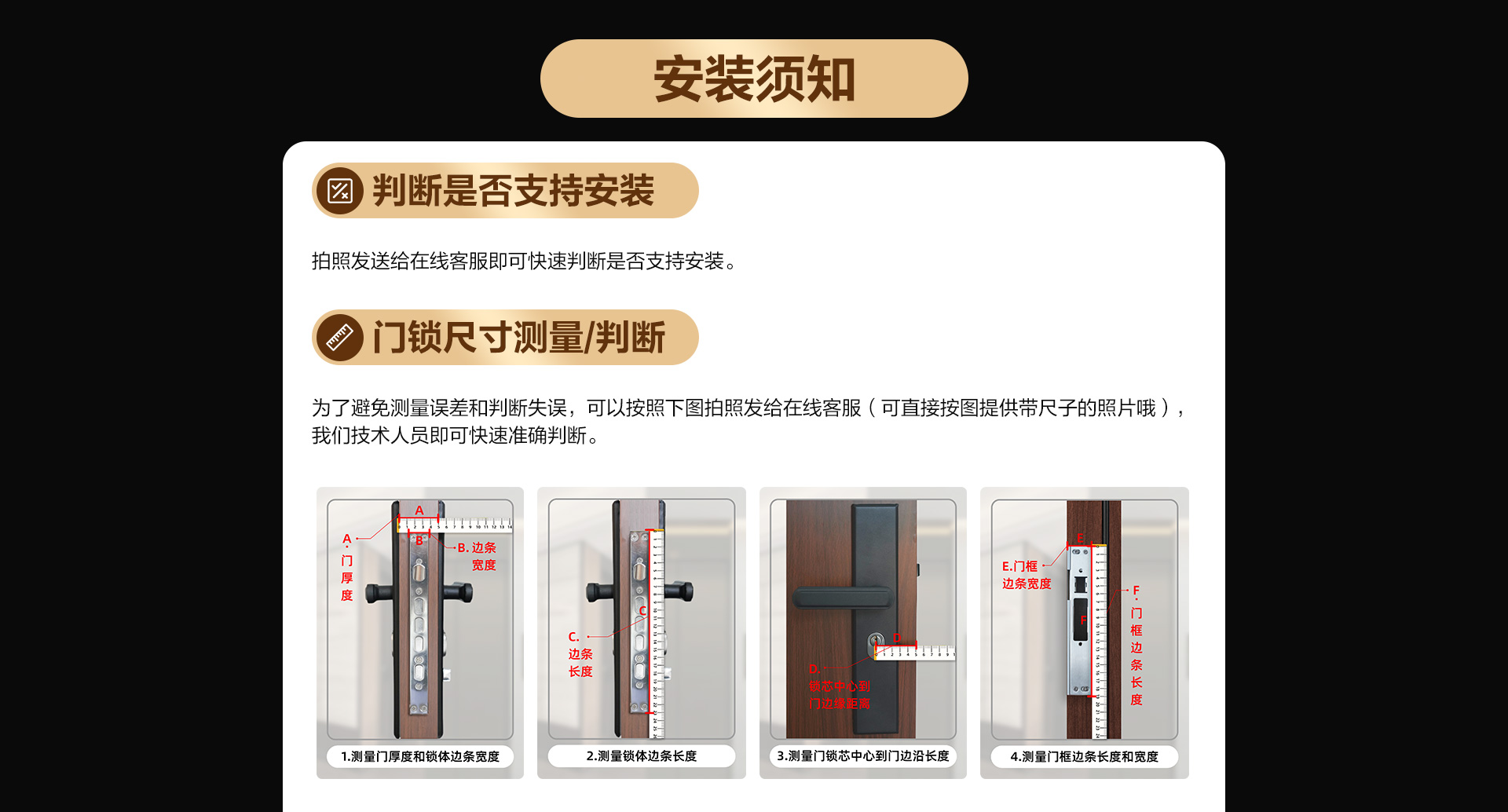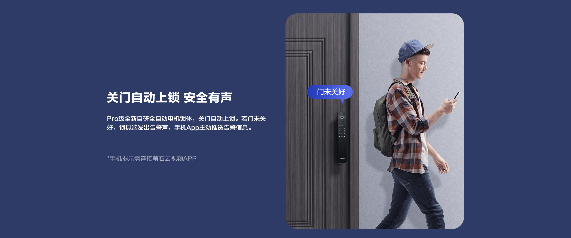 锁具安全防护   离家一键布防,锁体状态全检测,直插式C级锁芯,应急机械开锁,童锁防护,双重验证解锁,虚位密码设计,防小黑盒设计,试错锁定报警,布防模式室内开门报警,门锁被撬报警
