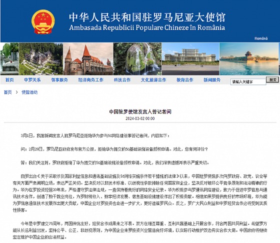 据中国驻罗马尼亚大使馆,3月1日,我馆新闻发言人就罗马尼亚拒绝华为参与5G网络建设事答记者问,内容如下:
