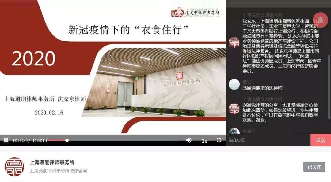 闵行律师积极调整服务方式,通过开通线上直播课程、微课堂等方式,为众多听众、观众及时解答法律咨询、提供法律建议。如恒在所石晨阳律师通过“公益微课”线上直播形式主讲了《疫情下复工&停工停产企业应对策略》,内容包括员工在企业不能提供口罩情况下能否拒绝上班、企业能否按旷工解除劳动合同等给网友释疑解惑,有近600人参加学习,听众发表评论和留言100余条,深受欢迎,反响热烈。恒在所高原通过网易新闻直播举办“疫情下商业租赁的法律”专题讲座,分析了疫情时期商业租赁合同纠纷等问题,有三万多人收看讲座。道朋所沈家东律师开通视频直播课程,围绕疫情期间群众关注的衣食住行相关法律问题进行解答,尤其是对疫情期间热议的劳资纠纷问题展开分析,并结合各地不同政策进行解读,免费分享,通过互联网咨询模式,解决特殊时期客户的法律需求。