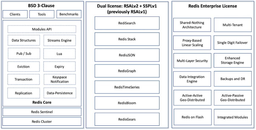 Ƶģ2018Redis俪RedisģЭAGPLıΪApache v2.0Commons ClauseϵЭ顣ܽCommons ClauseӦڿԴĿζſɻȡѷʡĺ·ַԴɣ䲢ǿԴЭ顣Լ֤ȫʹ۵ȨҲܾҵ2019꣬Redisٴ֤RedisģЭΪRSALv2ԴɣSSPLϵЭ顣ȻRedisһֱǿRedisδ֤һֱʹBSD֤ʵϣһֱƽʹBSD֤IJֻRedisġRedis LabijЩģ(RediSearch, Redis Graph ReJSON ReBloom Redis Stack)RSAL v2SSPLϵ֤ͼʾ