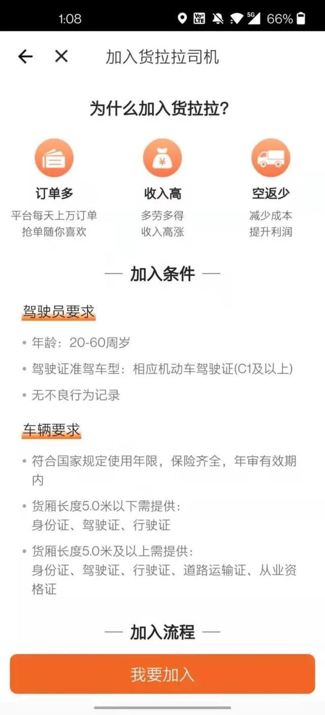 而小李的描述与货拉拉App上关于入驻司机的审核要求也并无太大的出入。货拉拉App上司机的加入条件为年龄20-60周岁;具备C1及以上驾驶执照,具有1年驾龄以上;无不良记录;并且需要提供身份证、驾驶证、行驶证、道路运输证等相关证件信息等。