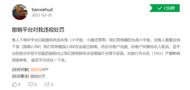 值得一提的是,货拉拉对于司机有着层层严格的评分考核,但对于安全投入方面并不多。货拉拉车内并未安装音像录制设备,货拉拉App也并无录音功能,并没有相应的安全监控。同时,货拉拉平台又允许在搬运货运服务上,司机与乘客双方可自行议价,导致了一旦司机与乘客在搬运服务费上产生分歧,多是各执一词,甚至产生冲突。在黑猫投诉平台上,也多位货拉拉司机反映平台“乱扣行为分”、“一刀切偏于乘客”,严重影响到司机的接单率。