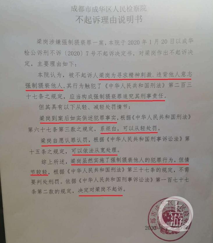 今年1月20日,成华区人民检察院对梁岗作出了不起诉决定。上游新闻获得的检方不起诉理由说明书显示,检方认为梁岗为寻求精神刺激,违背他人意志强制猥亵他人,应当以强制猥亵罪追究其刑事责任,但“梁岗到案后如实供述犯罪事实,系坦白,可以从轻处罚”,同时梁岗自愿认罪认罚,根据《刑事诉讼法》的规定可以依法从宽处理,综合上述理由,梁岗虽然实施了强制猥亵他人的犯罪,但犯罪情节较轻,不需要判处刑罚,决定对梁岗不起诉。