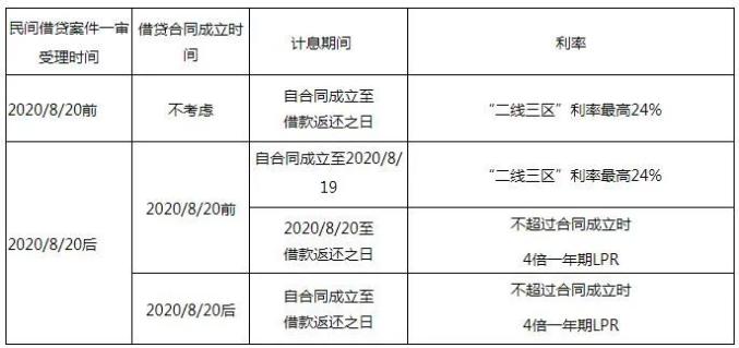 (三)新旧规定的衔接法释〔2020〕17号第三十一条规定:本规定施行后,人民法院新受理的一审民间借贷纠纷案件,适用本规定。2020年8月20日之后新受理的一审民间借贷案件,借贷合同成立于2020年8月20日之前,当事人请求适用当时的司法解释计算自合同成立到2020年819日的利息部分的,人民法院应予支持;对于自2020年8月20日到借款返还之日的利息部分,适用起诉时本规定的利率保护标准计算。 本规定施行后,最高人民法院以前作出的相关司法解释与本规定不一致的,以本规定为准。