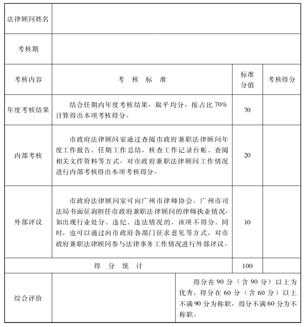 (四)市政府法律顾问室应当根据年度考核结果,结合内部考核与外部评议等情况,确定市政府兼职法律顾问任期届满绩效考核结果,并填写《广州市人民政府兼职法律顾问任期届满考核评分表》(见附件3)。