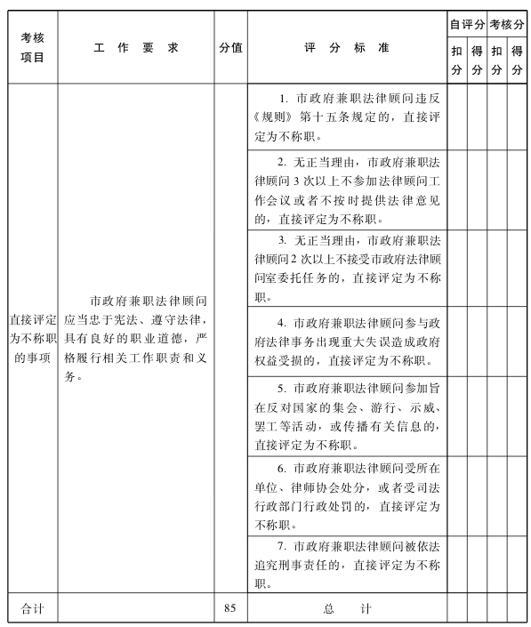 市政府兼职法律顾问年度考核基准分为85分,经考核后,得分在90分(含90分)以上为优秀,得分在60分(含60分)以上不满90分为称职,得分不满60分为不称职。考核评分采取扣分制和加分制相结合的方式,具体评分标准为: