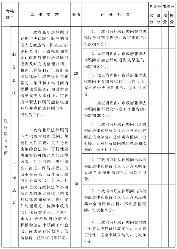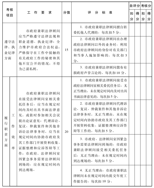 1.市政府兼职法律顾问提供法律服务时态度傲慢、敷衍推脱的,每次扣5分。