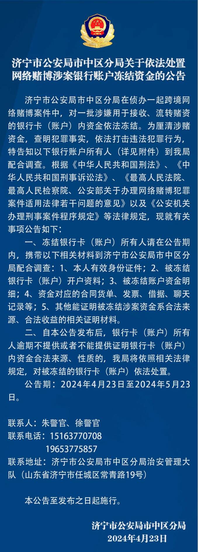 齐鲁网·闪电新闻4月23日讯 济宁市公安局市中区分局在侦办一起跨境网络赌博案件中,对一批涉嫌用于接收、流转赌资的银行卡(账户)内资金依法冻结。为厘清涉赌资金,查明犯罪事实,依法打击违法犯罪行为,特告知以下银行账户所有人(详见附件)到市中区分局配合调查。根据《中华人民共和国刑法》、《中华人民共和国刑事诉讼法》、《最高人民法院,最高人民检察院、公安部关于办理网络赌博犯罪案件适用法律若干问题的意见》以及《公安机关办理刑事案件程序规定》等法律规定,现就有关事项公告如下: