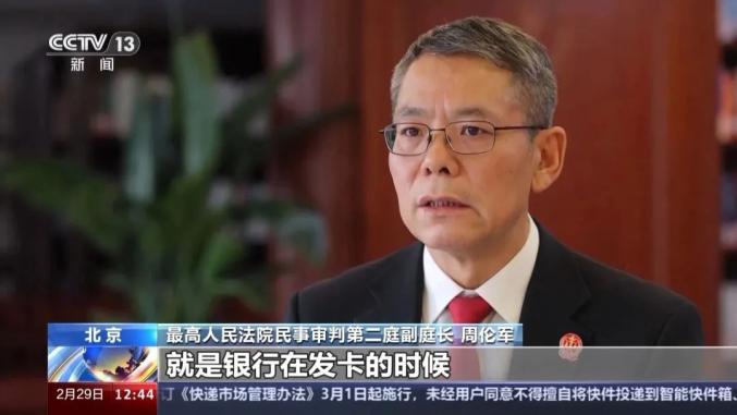 最高人民法院民事审判第二庭副庭长 周伦军:这样子真正把信用卡业务,在发卡授信、中间的消费、还款,包括事后的催收整个全过程,来实质性地解决这些问题。我们讲司法建议的发出实际上希望能够引领全社会形成一个理性消费、合理消费的这么一种消费观念,也推动金融机构依法合规经营,稳健审慎经营,共同维护这种诚实守信的金融文化。