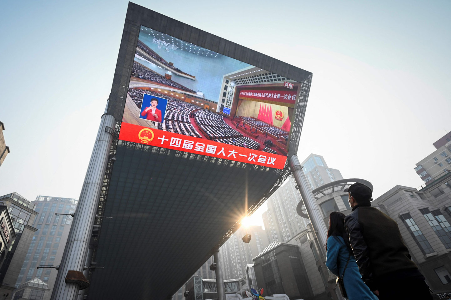 2023年3月5日,北京市民在户外屏幕上观看第十四届全国人民代表大会第一次会议开幕会的电视直播。 (人民视觉/图)