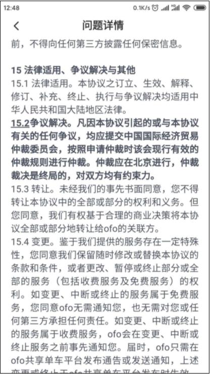 小孙和阮万锦律师认为,案件的核心争议点在于ofo是否以显著方式提示用户注意到该争议解决条款。在互联网的阅读环境下,用户的注意力很容易被分散,公司有义务对重要条款进行突出,但在ofo的用户协议中,并没有用加粗和下画线的方式对仲裁条款进行突出,甚至没有设置用户知晓并同意的勾选框,未能达到法律要求的显著效果。