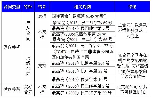 表一:纵向合同关系中主从合同仲裁条款扩张案例