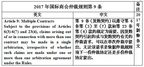 表五:国际商会仲裁中复数合同仲裁规则