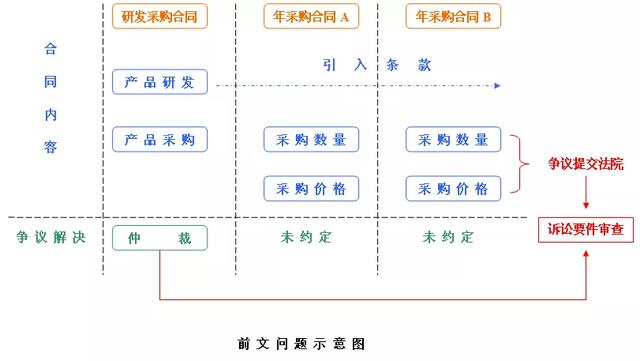 相关案例:甲企业为采购某汽车零部件,与乙企业签订产品开发及采购合同,约定由乙企业按照甲企业要求开发特定零部件,当产品开发达到甲企业设计标准时,乙企业按照甲企业年采购计划需求进行量产供应,并逐年签订年采购合同。双方同时在产品开发及采购合同中约定,今后签订的年采购合同中未约定事项按照本合同约定执行,如发生争议提交A仲裁委进行仲裁。后乙企业成功开发出产品,甲企业开始向乙企业进行采购并逐年签订年采购合同,但年采购合同并未约定仲裁。因采购过程中发生质量问题,甲企业持年采购合同向法院提起诉讼,要求乙企业承担违约责任,乙企业在答辩时主张该争议应提交A仲裁委进行仲裁,而甲企业反驳称该争议为年采购合同项下争议,年采购合同为独立合同,不应受产品开发及采购合同仲裁条款约束。