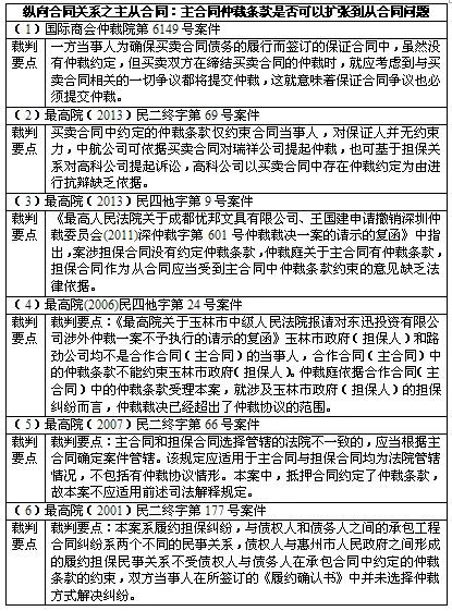 通过对上述裁判的总结可以发现,实务中在处理仲裁约定可否应用于未约定的相关合同的问题时,可分成如下几种观点:第一,担保类主从合同关系中,主合同仲裁条款不得扩张到从合同之上;第二,如合同之间存在明显的支配关系,一般可以将上级合同仲裁条款扩张到低级别合同中;第三,如合同之间存在继受关系,一般可以将原合同仲裁条款扩张到补充合同中;第四,在合同间无支配或继受关系时,即便这些合同联系再密切也不可相互扩张。