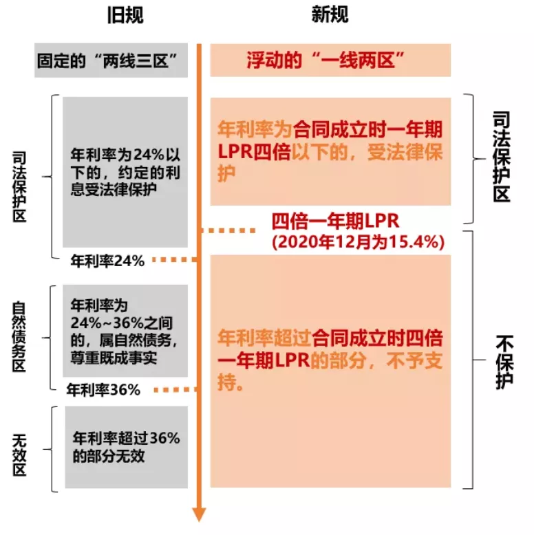 利率保护上限用通俗的话说,就是最高法为民间借贷利率规定了一个最高值,超过这个最高值的利息,即使借贷双方约定,起诉时法院也不会支持偿还。原先的司法实践中,法院采取“固定的两线三区”的规定,而《新规》实施后调整为“浮动的一线两区”。(见下图)