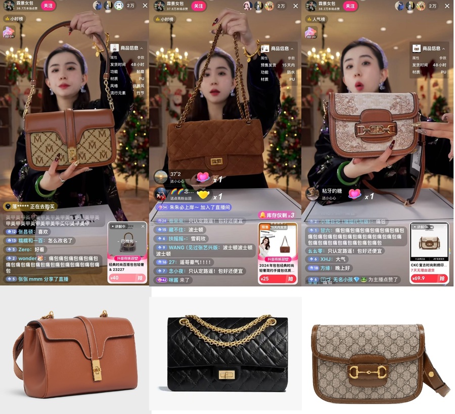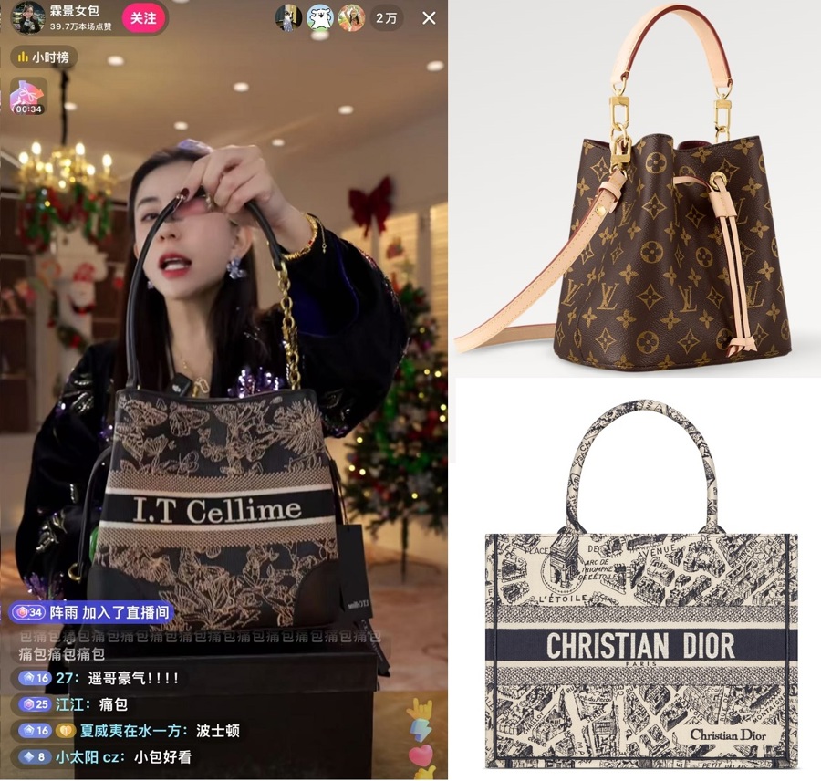 路遥直播间的不少商品同样存在法律风险。一些观众发现,路遥直播间里多款低价包与知名品牌设计“撞款”,还有一些款式使用设计元素则与三丽鸥、迪士尼等品牌持有形象雷同。以其力推的“浮生若梦”为例,在一些业内人士眼中像多个品牌经典款式的杂糅:其包型与路易·威登水桶包相似,花纹则与迪奥的帆布包接近。