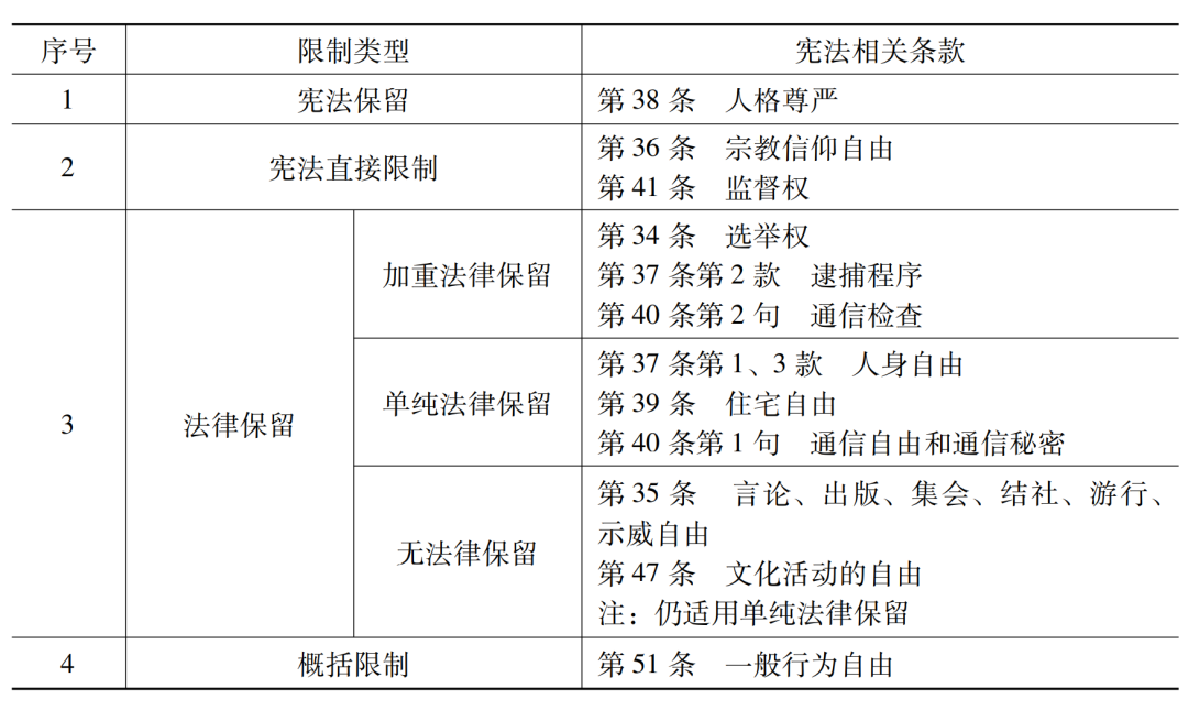 我国宪法对基本权利的不同限制,可见下表:
