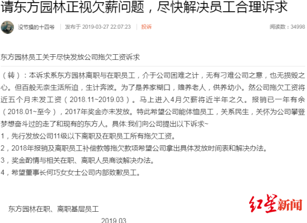 红星新闻记者发现,相关媒体所配的图片来自于微博名为“没节操的十四爷”的博主,该博主于2019年3月29日发布名为《请东方园林正视欠薪问题,尽快解决员工合理诉求》微博文章称:公司拖欠工资将近5个月未发工资(2018.11~2019.03)。马上进入4月欠薪将近半年之久。报销已一年有余(2018.01至今),2017年奖金亦未发放。