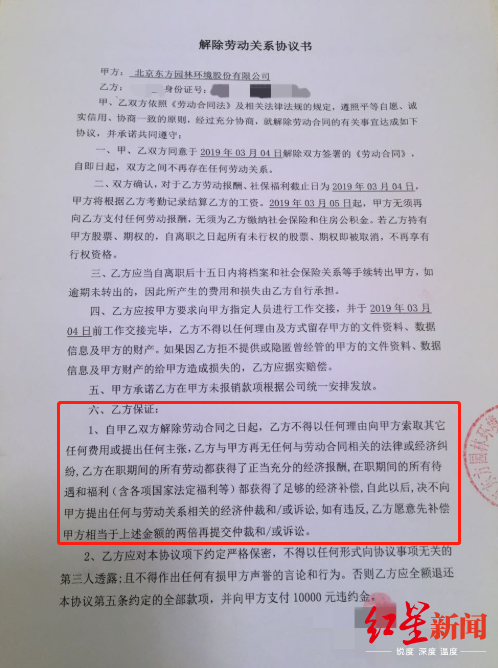 对于东方园林与员工签订的《解除劳动关系协议书》,张先生说这个协议是东方园林人力负责人张振迪那边发布的模板,全东方园林都是用的这个模板,“这样的霸王条款,离职人员人手一个。”