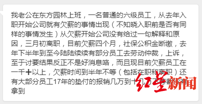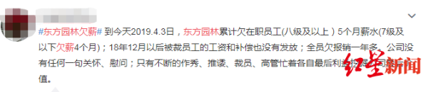 记者在相关微博话题下发现,有多名自称有多名自称东方园林员工的博主发微博称公司已经欠了几千名员工四五个月的工资,且员工讨要工资诉求无门,相关微博称公司只有作秀和推诿,没有任何一句关怀和慰问……