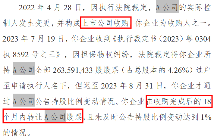 案例中,某公司在2022年4月28日至2023年7月19日期间,因担保物权纠纷,被法院将所持收购公司股过户至执行人名下,但迟至2023年8月31日才通过收购公司公告持股比例变动情况,公司在收购后转让距离控制权变更时间不足18个月,且未及时公告持股比例变动达到1%。违反了《上市公司收购管理办法》第七十四条和第十三条第三款的规定。 以上就是关于股份限售的相关规定,如有遗漏,欢迎大家在评论区补充哦。更多的案例可以通过【易董--监管-违规案例】查看!接下来我们一起来看看相关合规问答吧! Q 股票定增的发行价格低于其每股净资产,那么6个月后参与定增的新股东是否能解除限售后卖出?