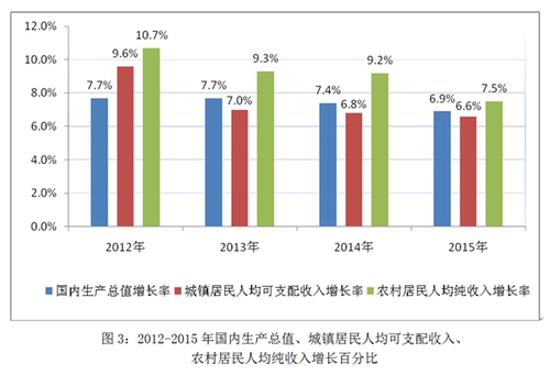 2012-2015年,居民人均可支配收入增长速度总体上高于同期国内生产总值增长速度,城镇居民人均可支配收入和农村居民人均纯收入年均增长率分别为7.5%和9.2%,超过7%的计划预期目标。