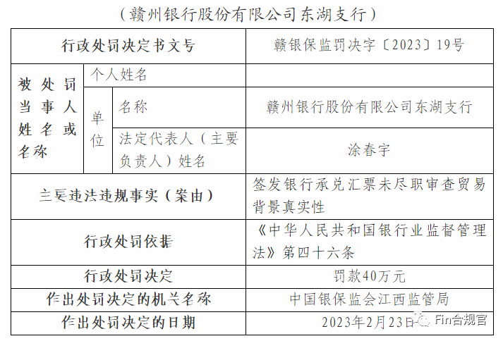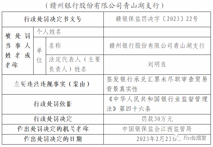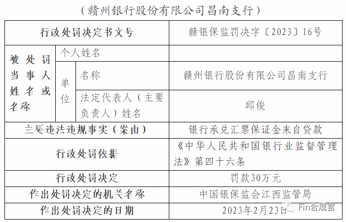 3月3日,江西银保监局发布的处罚信息公开表显示,对赣州银行及职工开出9份罚单,分别对4家支行因“银行承兑汇票保证金来自贷款”或“签发银行承兑汇票未尽职审查贸易背景真实性”两个问题累计处以120万元行政处罚,并对5名责任人进行警告处罚。