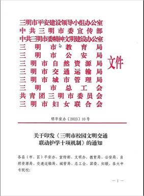 为进一步加强涉校交通安全管理,全面提高学生交通安全意识、法治意识、规则意识和文明意识,共同创建安全、有序、畅通、文明的校园周边道路交通环境,切实保障学生上下学交通安全,推进校园文明交通创建常态化机制化,引领道路交通安全社会共治,市平安办、市委宣传部、市委文明办、市教育局、市公安局、市自然资源局、市交通运输局、市城管局、市总工会、团市委、市妇联等十一部门联合下发《三明市校园文明交通联动护学十项机制》。