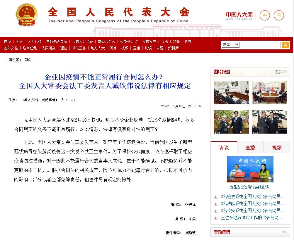 2.《中国人大》全媒体北京2月10日讯:全国人大常委会法工委发言人、研究室主任臧铁伟说:当前我国发生了新型冠状病毒感染肺炎疫情这一突发公共卫生事件,为了保护公众健康,政府也采取了相应疫情防控措施,对于因此不能履行合同的当事人来说,属于不能预见,不能避免并不能克服的不可抗力。据此本次肺炎疫情属于不可抗力事件。
