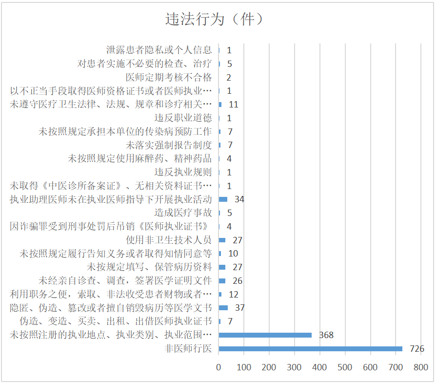 从下图2可知,适用《医师法》进行行政处罚的主要违法行为表现为:非医师行医,即未取得医师资格证书和执业证书开展诊疗服务活动,未按照注册的执业地点、执业类别、执业范围执业,伪造、变造、买卖、出租、出借医师执业证书,隐匿、伪造、篡改或者擅自销毁病历等医学文书,利用职务之便,索取、非法收受患者财物或者牟取其他不正当利益,未经亲自诊查、调查,签署医学证明文件,未按规定填写、保管病历资料,未按照规定履行告知义务或者取得知情同意,使用非卫生技术人员提供诊疗服务活动,因诈骗罪受到刑事处罚后吊销《医师执业证书》,造成医疗事故,执业助理医师未在执业医师指导下开展执业活动,未取得《中医诊所备案证》、无相关资料证书擅自从事执业活动,违反执业规则未按照规定使用麻醉药、精神药品,未落实强制报告制度,未按照规定承担本单位的传染病预防工作。其中,行政处罚案件总数前五位分别为:非医师行医案件达726件,未按照注册的执业地点、执业类别、执业范围执业达368件,隐匿、伪造、篡改或者擅自销毁病历等医学文书达37件,执业助理医师未在执业医师指导下开展执业活动达34件,未按规定填写、保管病历资料27件,使用非卫生技术人员27件。
